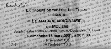| Pour divertir son ami qui, croit-elle, a plus besoin de divertissemement que de médicaments, on amène au Malade Imaginaire (dans la pièce originale) des saltimbanques. | Dans la version de la Troupe des Treize, ces saltimbanques sont des danseurs brésiliens déguisés en esclaves, les capoeiristes Alie, Denis, Hugo, Luc et Philippe |